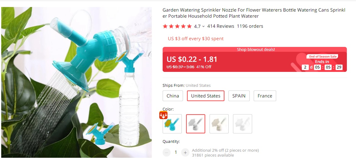 Ở bức ảnh trên, mình đã chọn bình tưới cây này. Bạn có thể thấy sản phẩm đã được 4.7 lượt đánh giá và 1196 orders điều này có nghĩa đây là nhà cung cấp đáng tin cây.