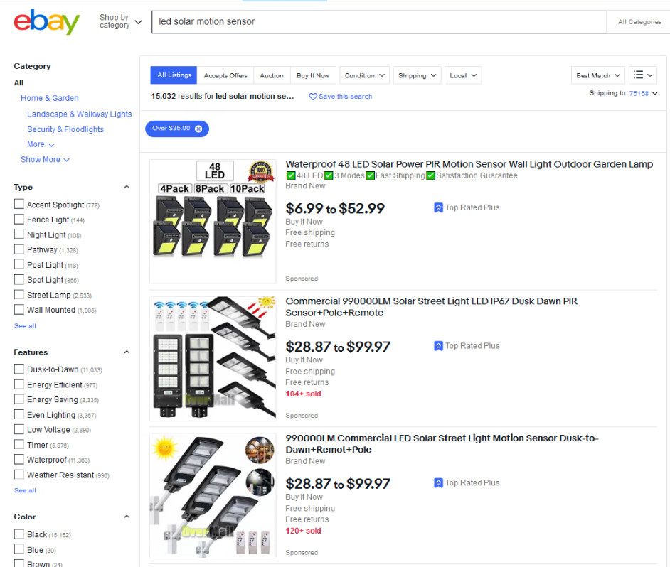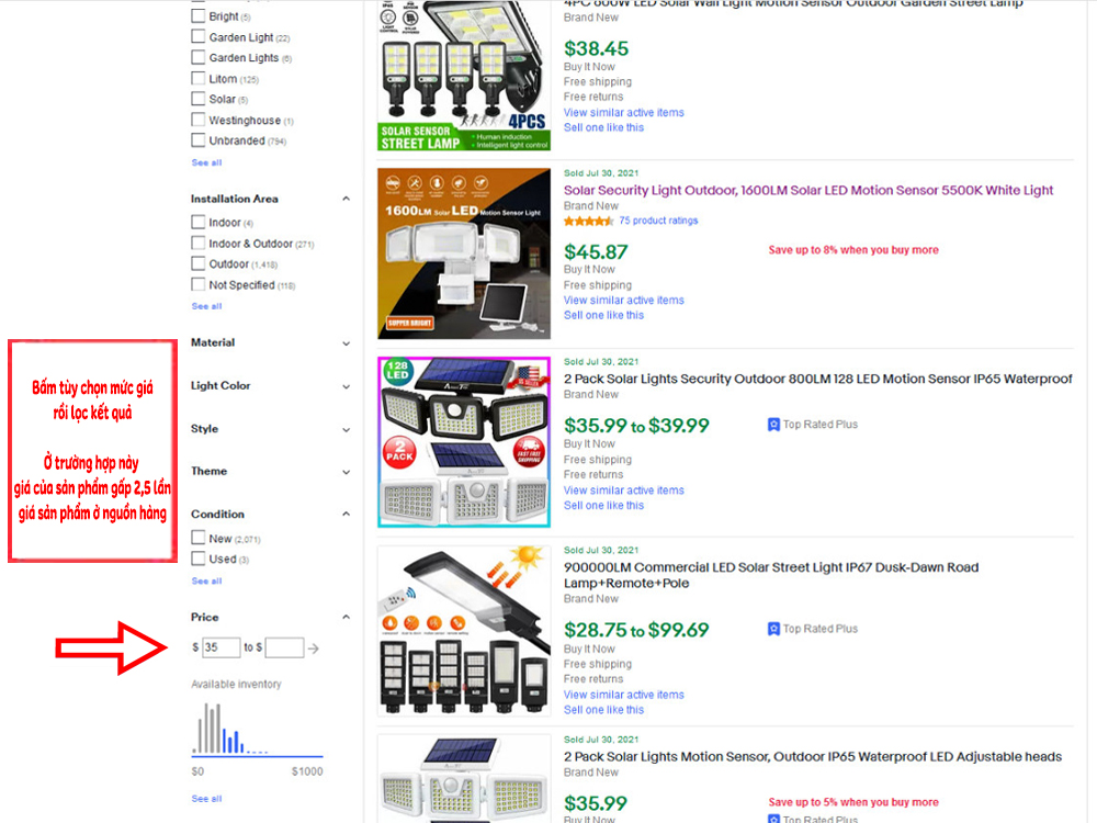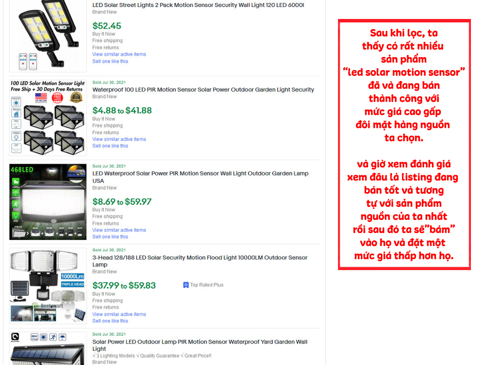Sau khi lọc, ta sẽ thấy rằng có rất nhiều mặt hàng “led solar motion sensor” đã và đang bán thành công với mức giá cao gấp đôi so với mặt hàng nguồn mà ta đã chọn.